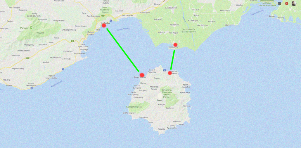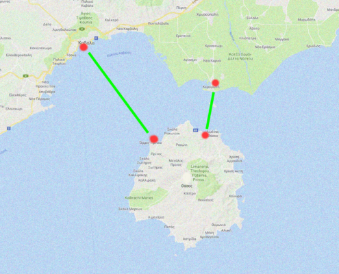 Η κύρια πόλη του νησιού, Θάσος, (Λιμένας) συνδέεται με την Καβάλα, και την Κεραμωτή.